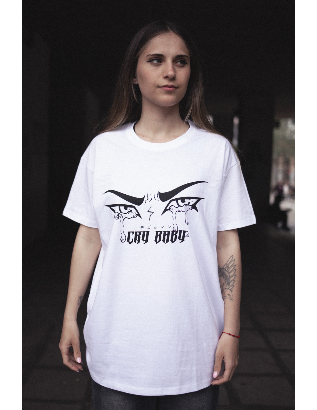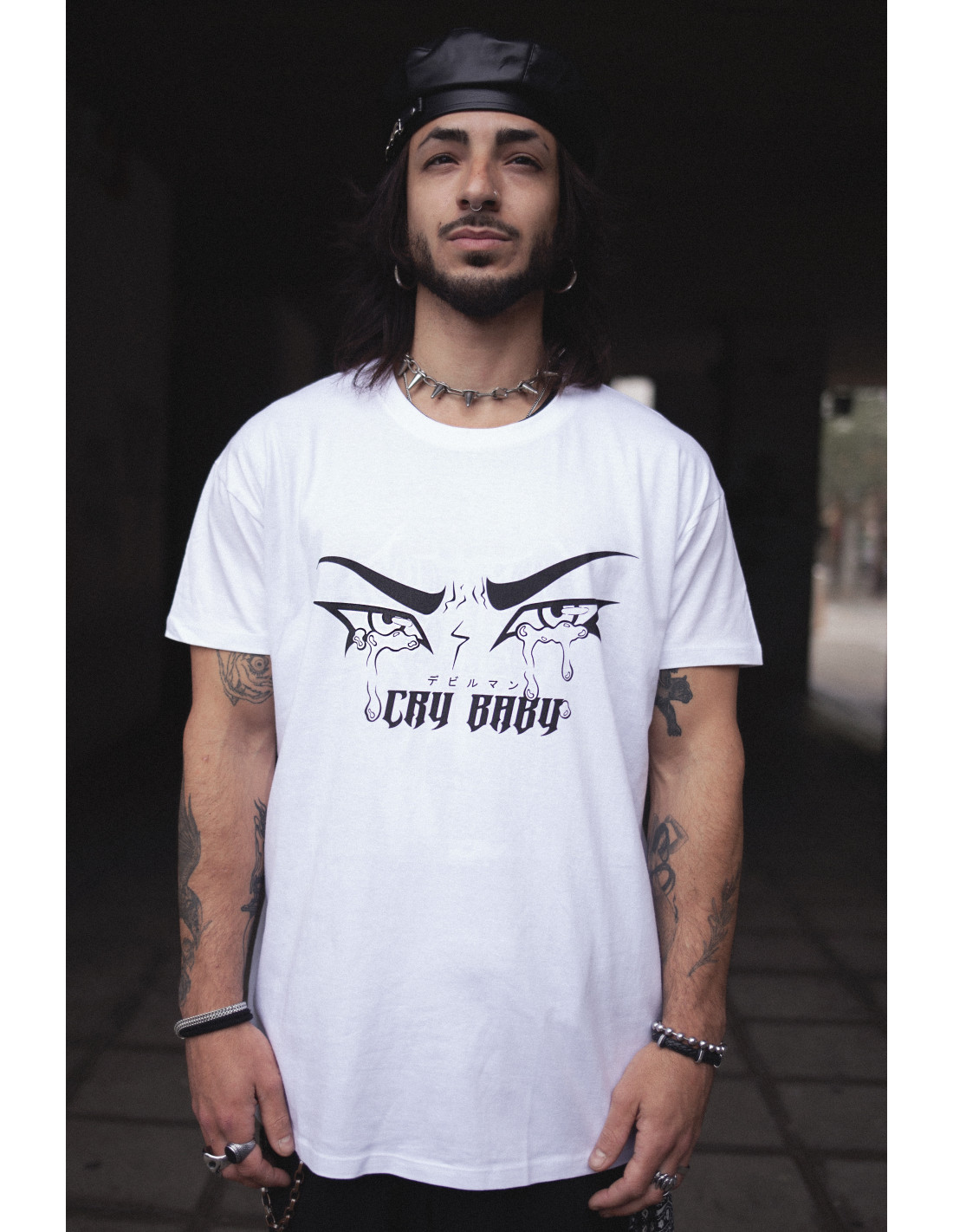 Camiseta blanca diseño CRYBABY inspirado en el personaje Akira Fudo del anime Devilman Crybaby.
